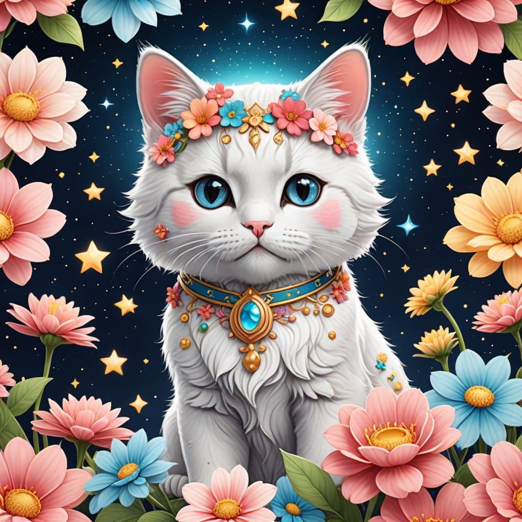 This image shows a cute kawaii-style cat with a celestial and floral-themed design. The artwork features a soft, realistic rendering of the animal with intricate floral patterns.