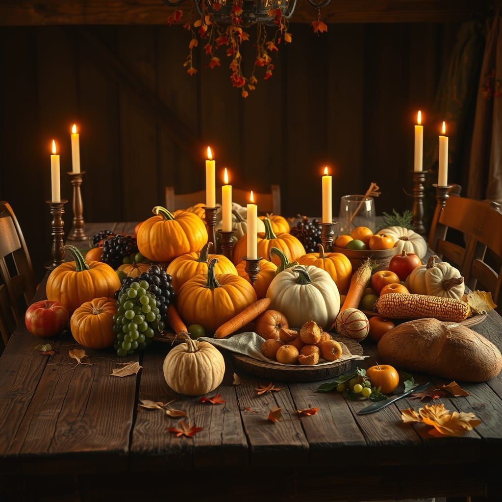 This image showcases a rustic farm table laden with autumn produce like pumpkins, apples, and grapes, alongside bread. Warm, golden hour light and flickering candles create a cozy atmosphere. Rendered with painterly realism and cinematic composition.