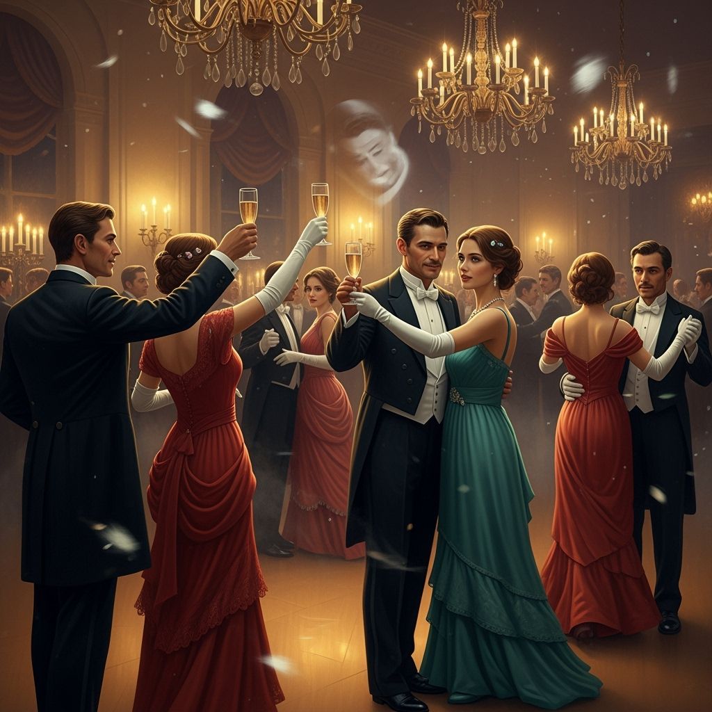 This ultra-detailed oil painting depicts a vintage 1900s ballroom party. Figures in elegant attire toast and dance amidst a ghostly haze and supernatural glow, creating a dreamlike, haunted atmosphere.