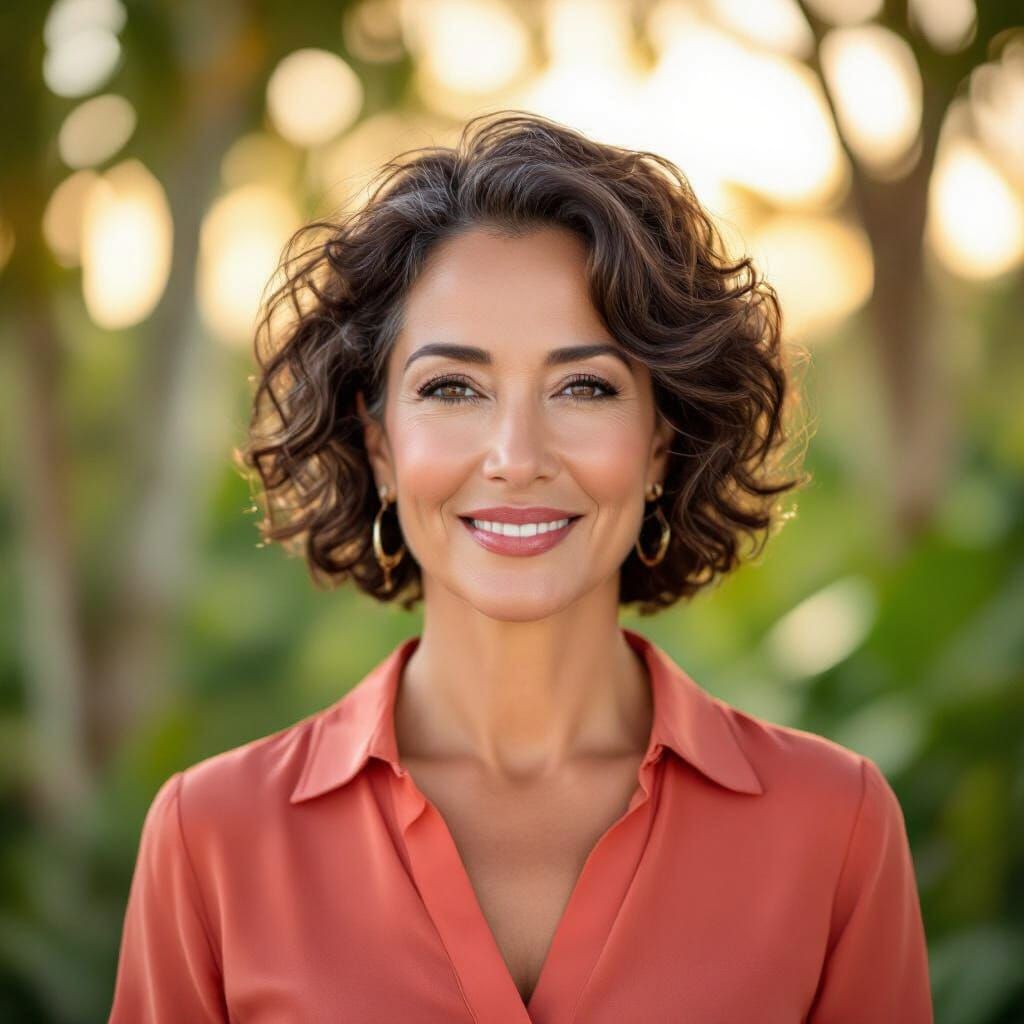 A cinematic portrait of a 50-year-old Brazilian woman with a warm tan complexion and a gentle, confident smile. Captured in soft golden hour light with a shallow depth of field, highlighting lush tropical foliage.