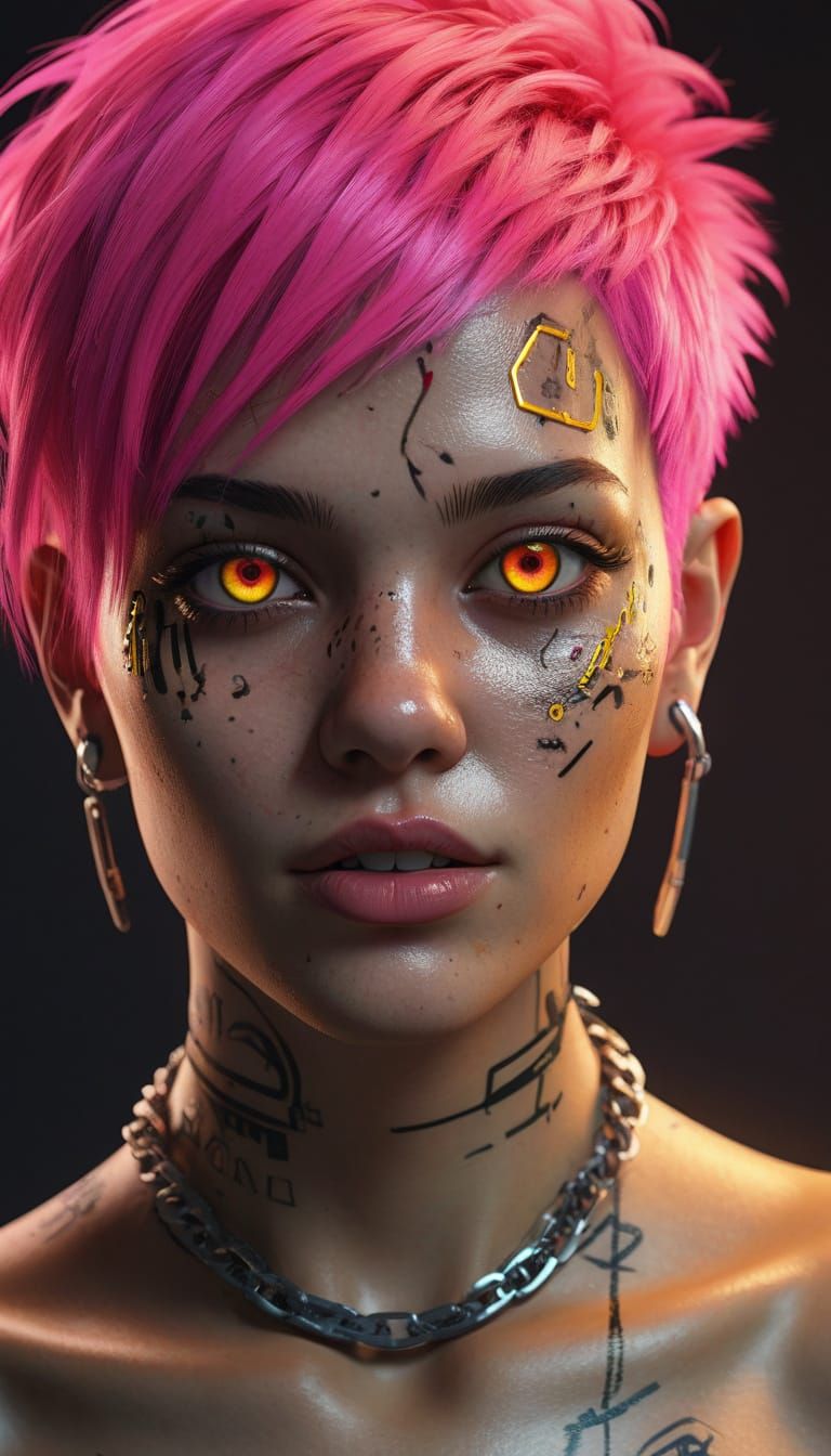 This image shows a close-up 3D portrait of a futuristic woman with a neon pink haircut and glowing metallic eyes. Rendered as digital art in a cyberpunk aesthetic.