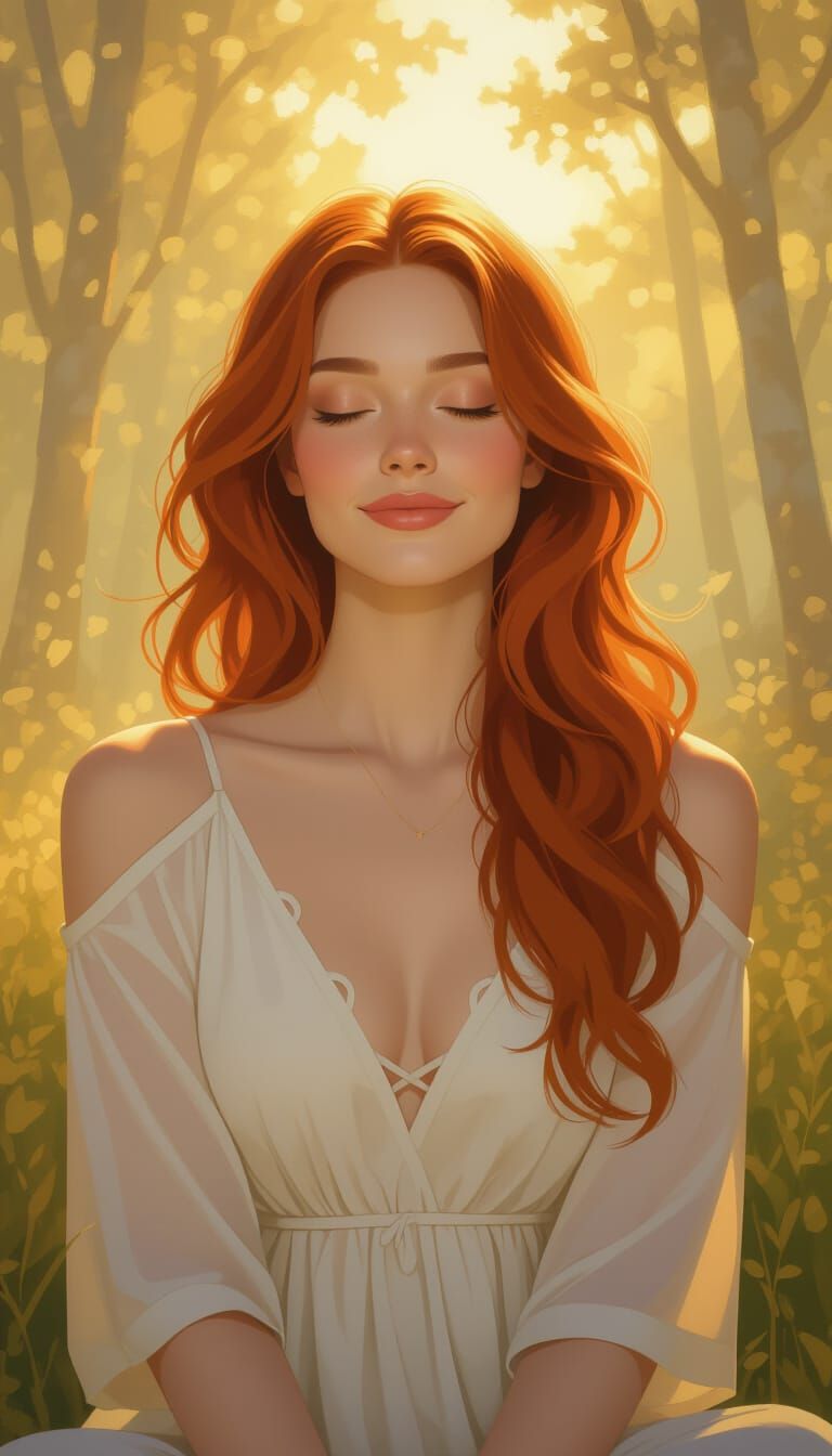 This image shows a tranquil scene of an auburn-haired woman in a misty forest clearing, bathed in soft golden light, conveying a sense of calm and ethereal beauty. Rendered as a digital matte painting.