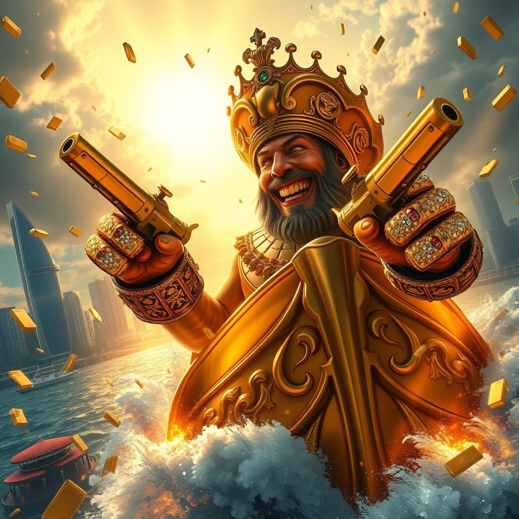 A striking image of a golden pirate ship and its lord wreaking havoc on a futuristic Singapore skyline, amidst a chaotic, cinematic scene reminiscent of Syd Mead's futuristic cities, with a dynamic energy reminiscent of Simon Stalenhag's atmospheric art.