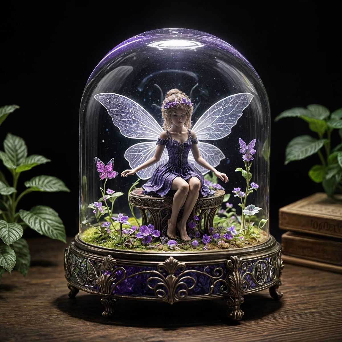 This image shows a realistic miniature bioluminescent fairy displayed inside an antique, transparent glass music box, illuminated by dramatic cinematic lighting.