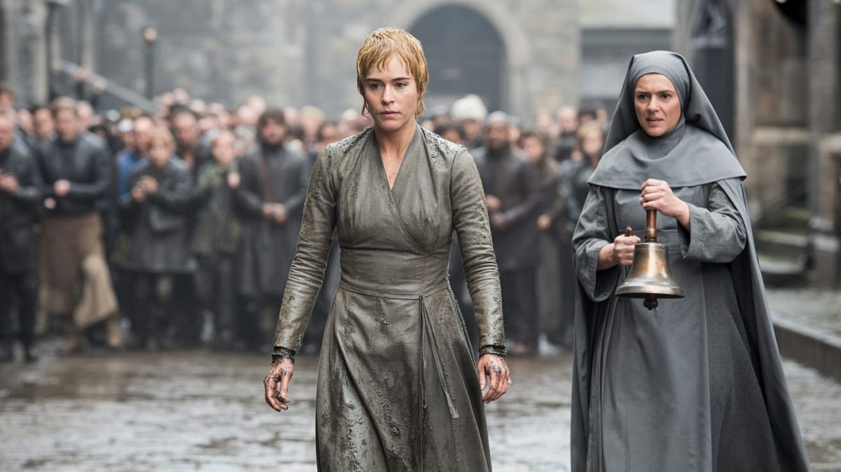 This image captures a cinematic scene of a character's walk of atonement. The individual is barefoot and robed, displaying a mix of sorrow and defiance amidst a hostile crowd under an overcast sky.