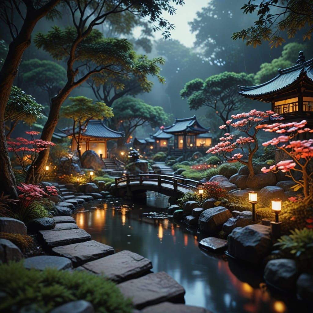 This image showcases animated figures sculpted in relief on diverse materials, rendered in a vibrant gouache style with thick, textured impasto layers. Dynamic lighting and chiaroscuro effects enhance intricate details within a serene Japanese garden setting.