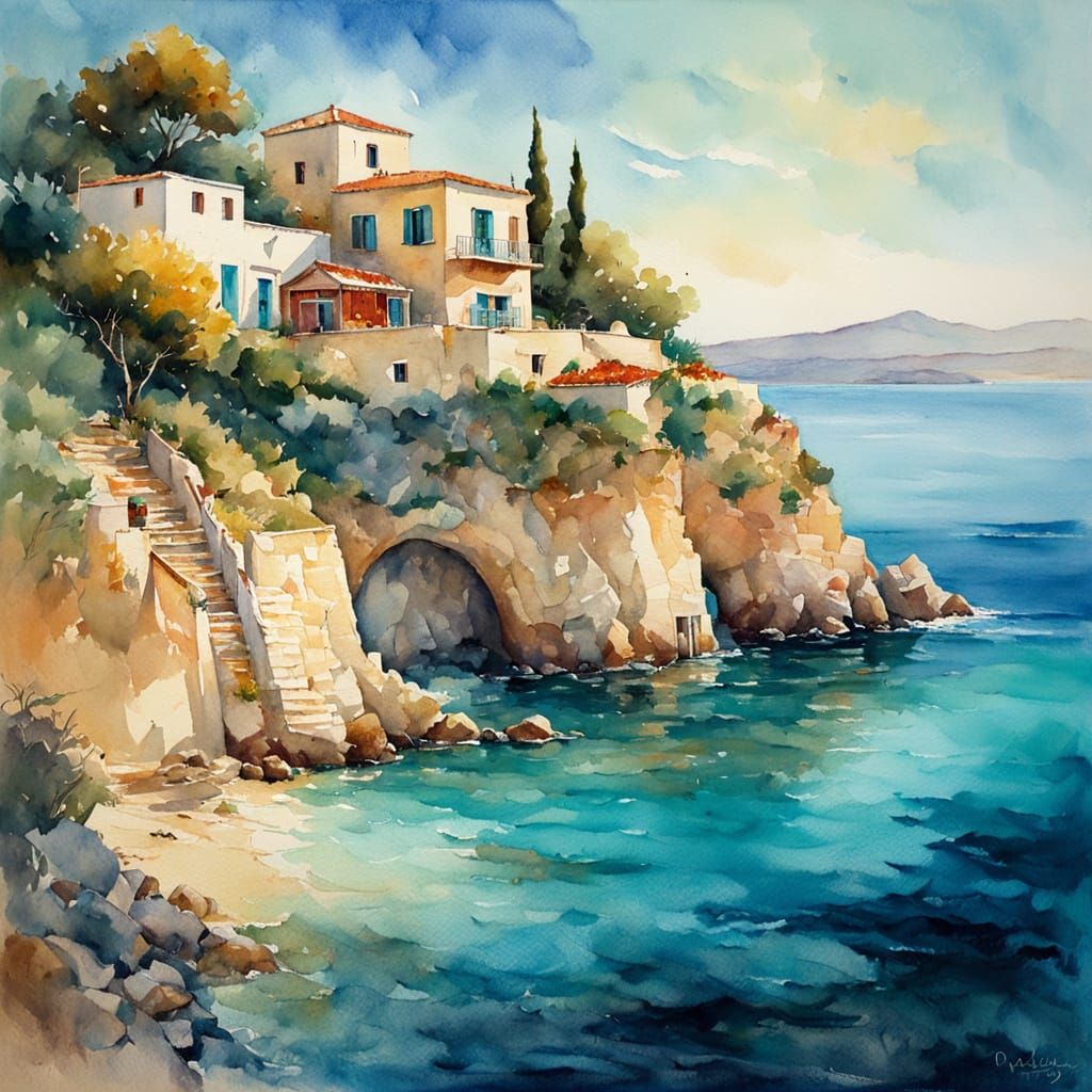 Make your own beautiful watercolor paintings of Greek coastal scenes with our free AI image generator.