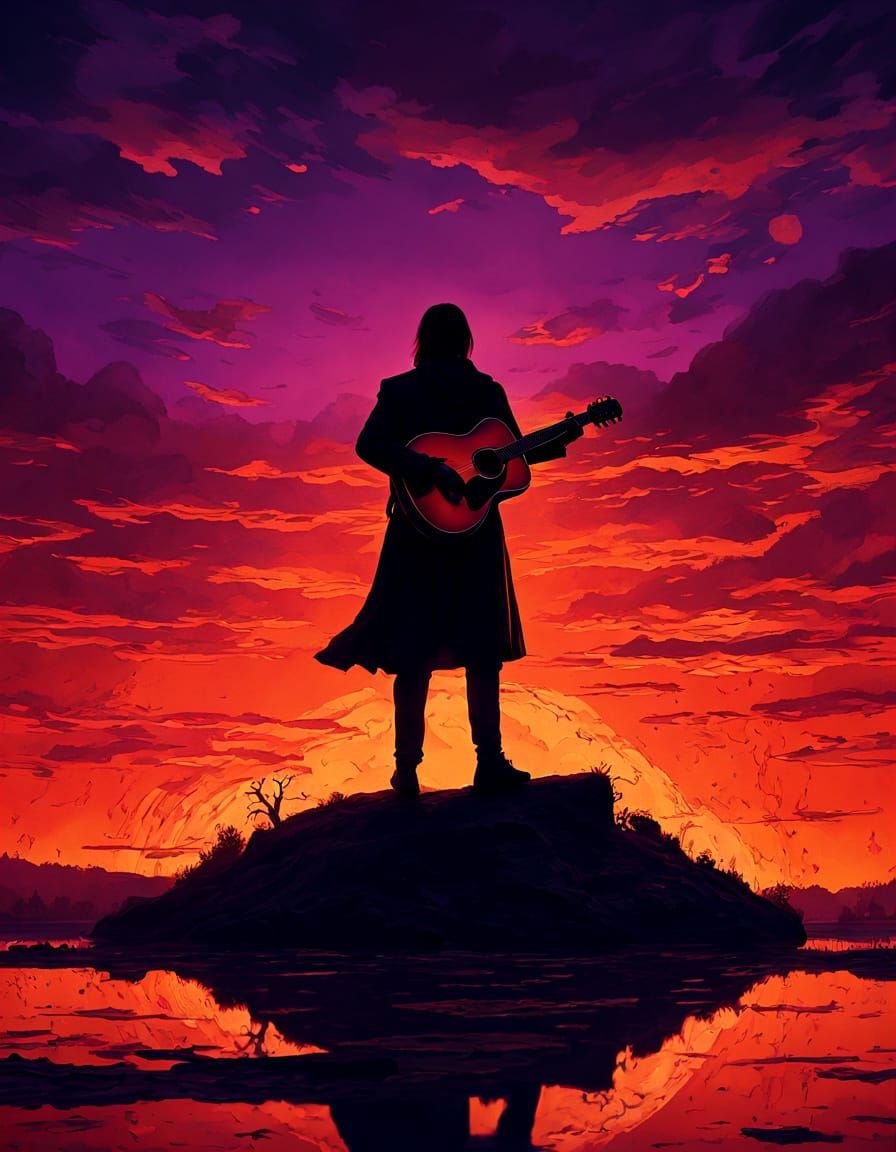 A dramatic image of a lone figure silhouetted against a vibrant sunset, holding a battle-worn guitar with intricate carvings and an ethereal glow, set against a warm and atmospheric background.