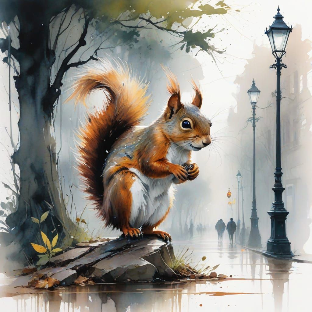 This image shows a misty urban park at night. Old streetlamps and neon lights illuminate a squirrel on a winding path in a blend of watercolor and cinematic styles.