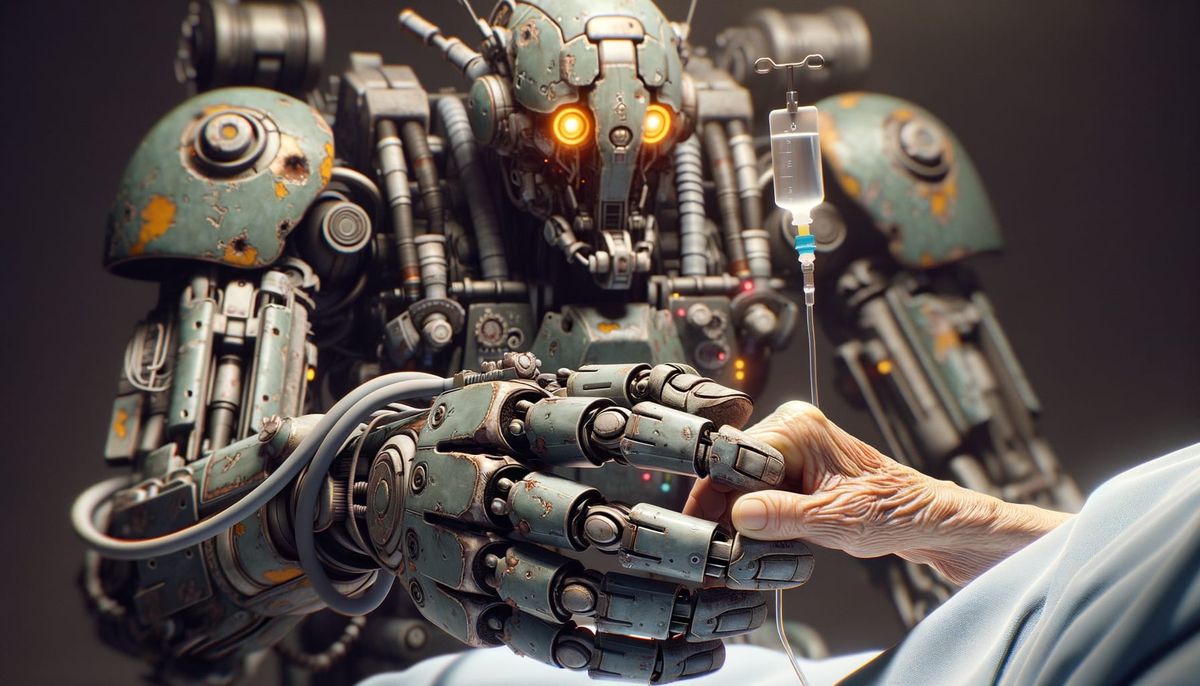 Post Apocalyptic Health Care. Note the state of disrepair on the repurposed war mecha.