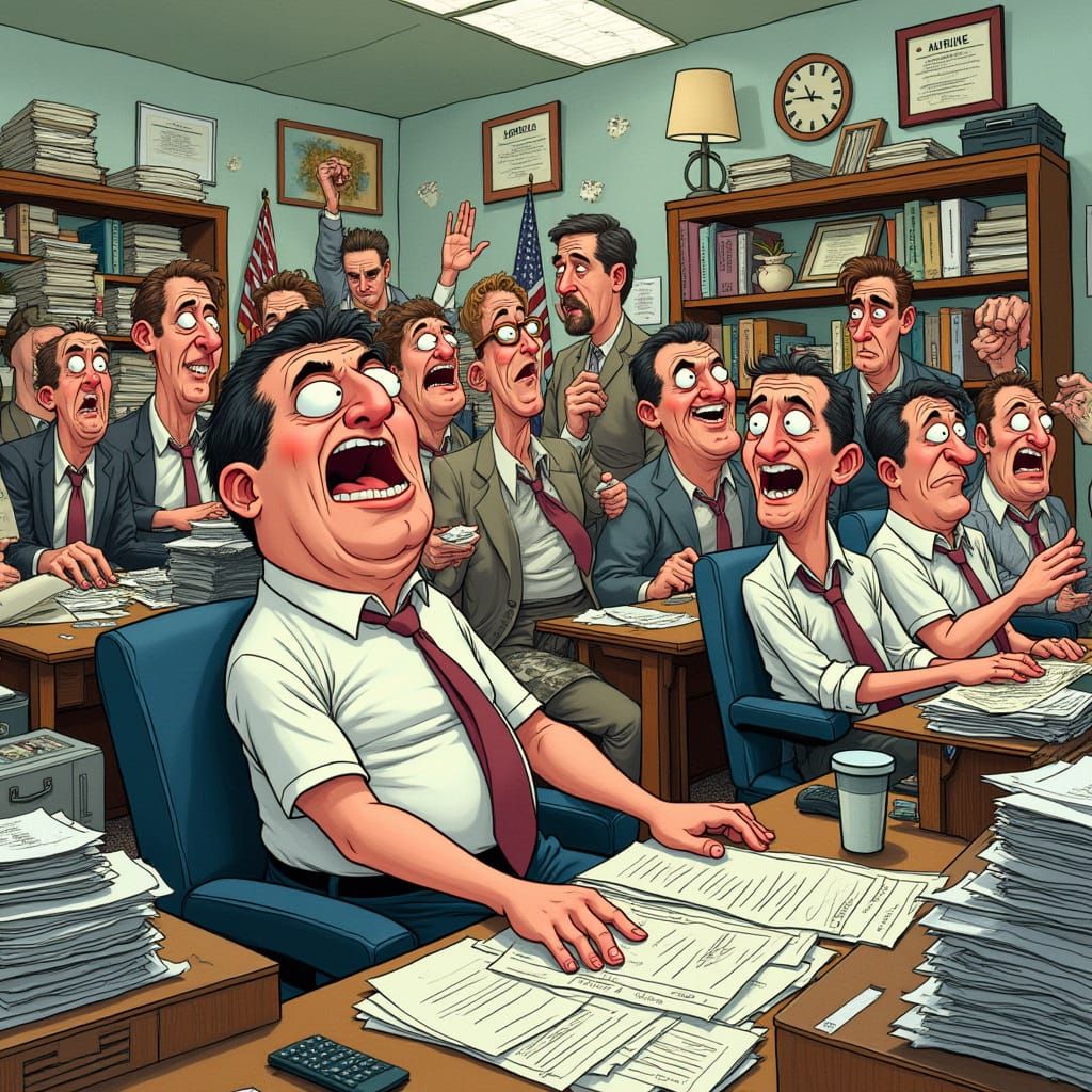A bustling office scene of frazzled insurance agents, cluttered desks, and paperwork, brought to life with bold lines, vibrant colors, and a dash of irony, reminiscent of graphic novels and caricatured satire.