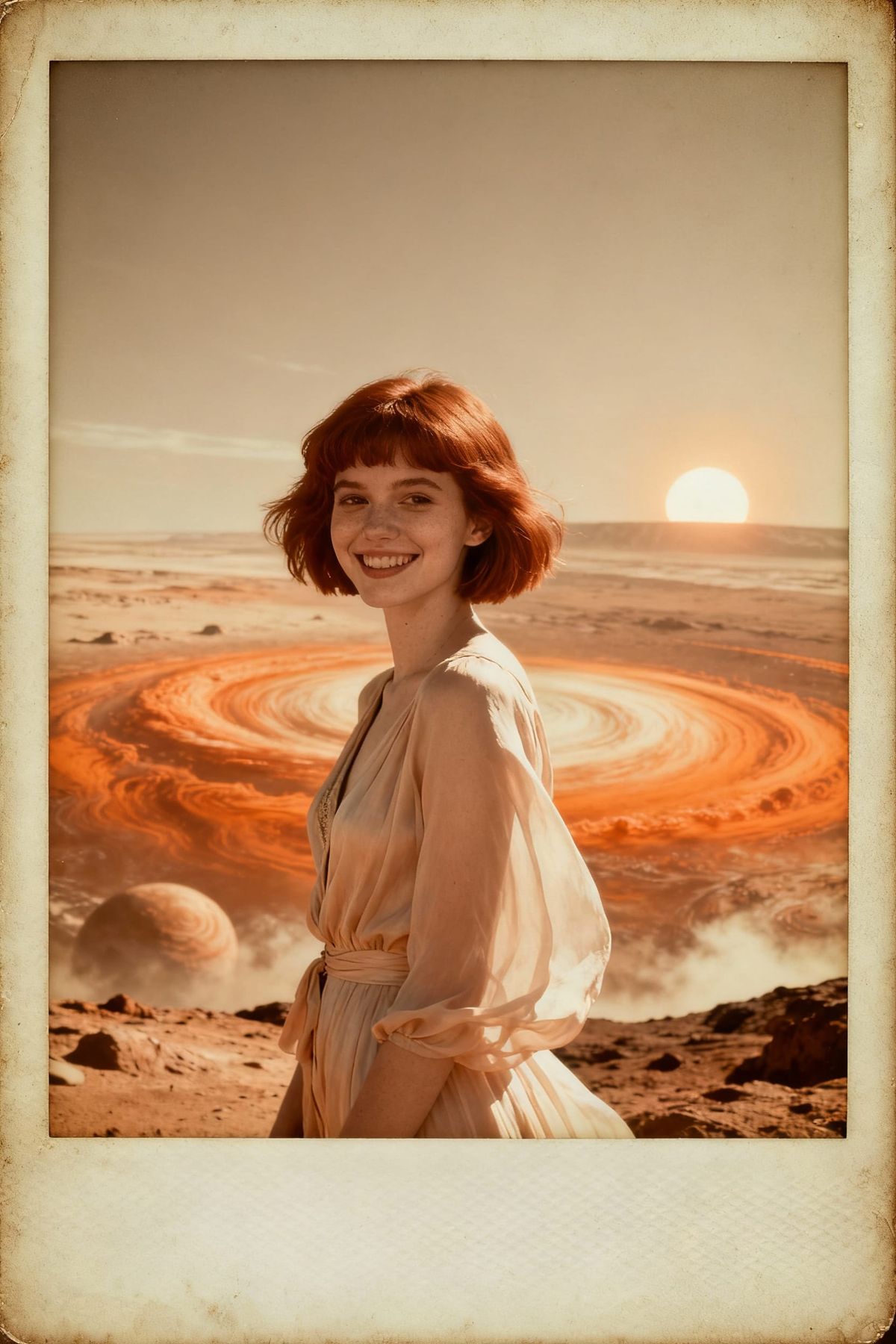 This image shows a smiling young woman with short auburn hair enjoying a vacation on Venus in the year 2050, captured in a vintage Polaroid aesthetic.