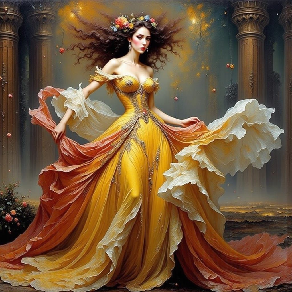 This image shows a beautiful woman wearing a stunning gown. The image has a unique aesthetic created using LoRA models, resulting in a digitally enhanced portrait.