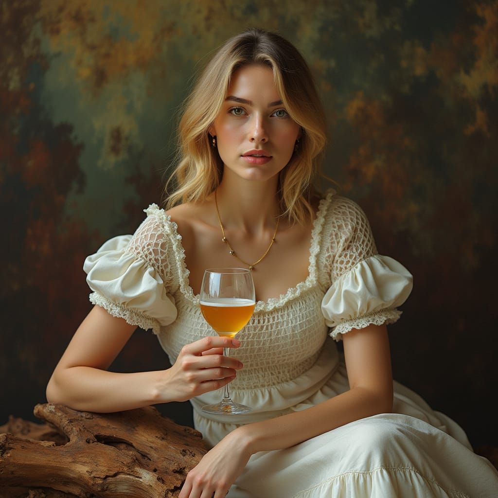 This image showcases a beautiful, curvy woman with a stunning face, adorned with intricate details and a mix of vibrant colors. The artwork combines the elegance of Old Masters with a modern, high-resolution aesthetic.