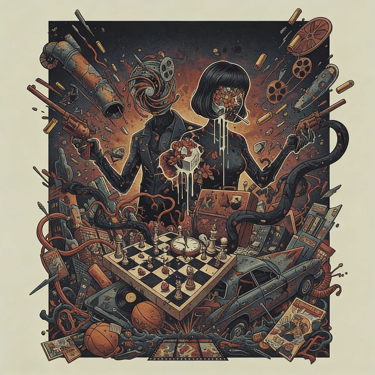 This photorealistic concept art depicts a surreal, distorted reality with a mood of damage and loss, meticulously composed with negative space for atmospheric impact.