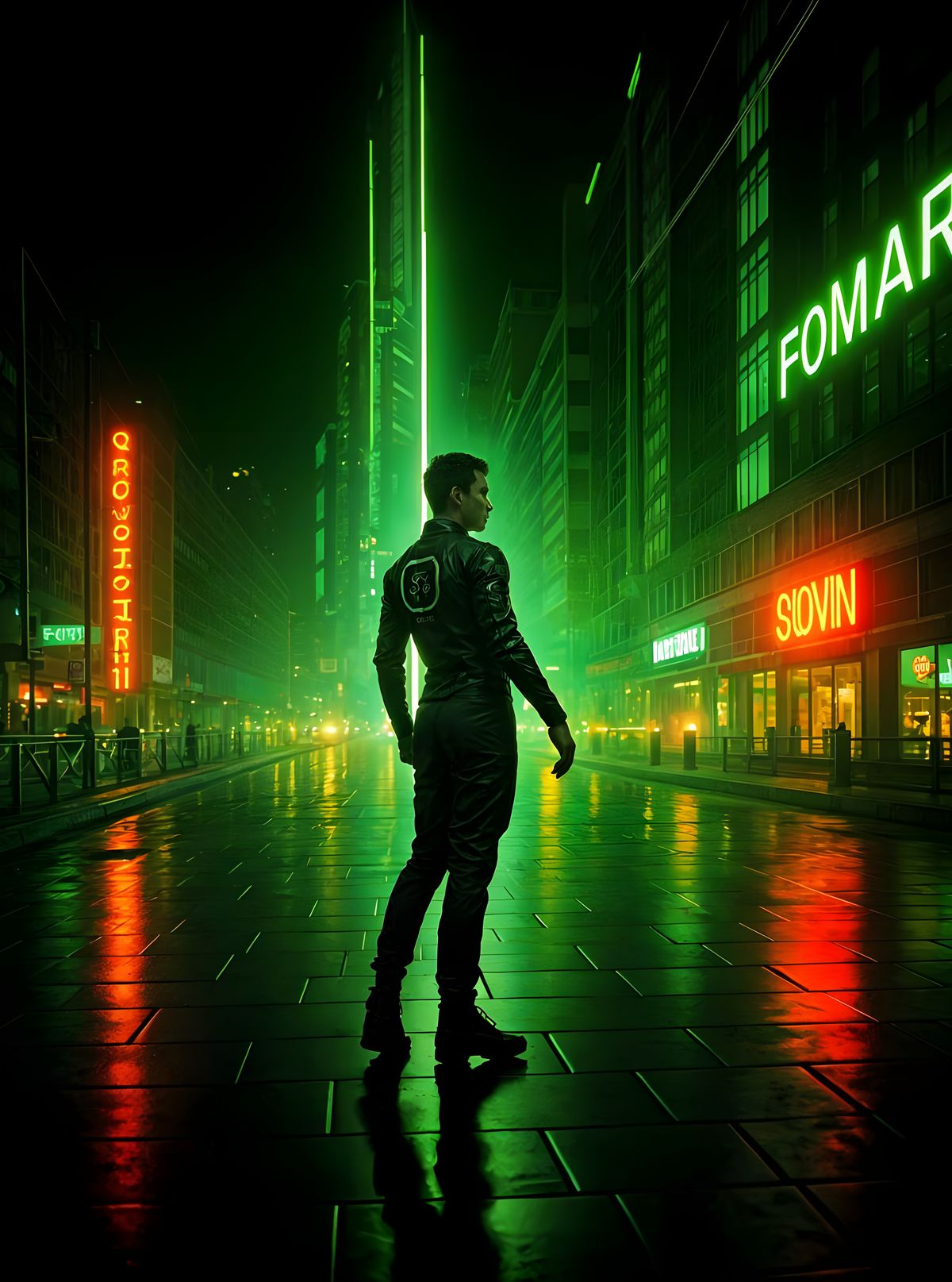 A vibrant artwork showcasing neon green and orange hues in a futuristic setting. The image captures a dynamic scene with glowing effects and a moody, cinematic atmosphere, reminiscent of a film still.
