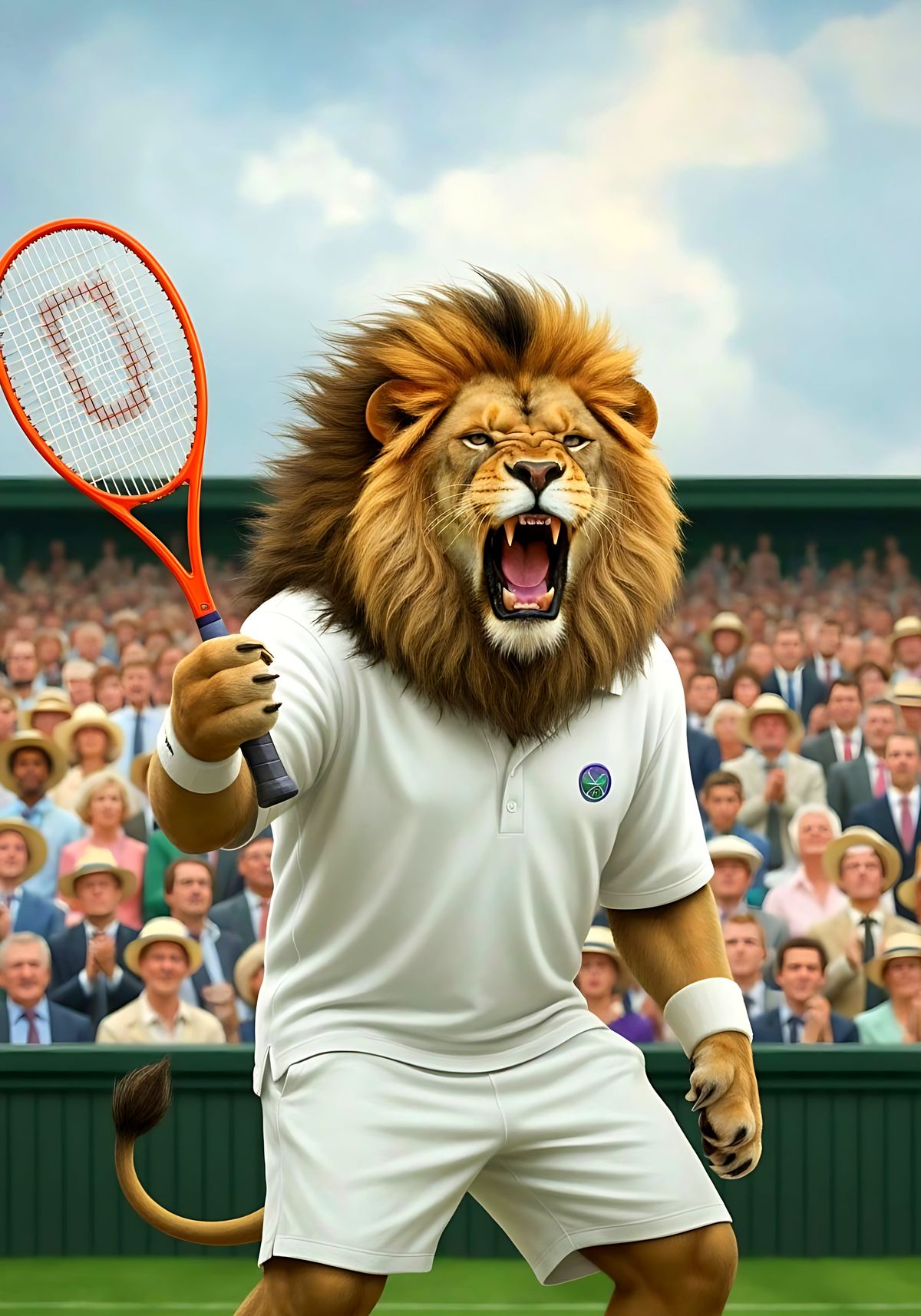 A vibrant image of a lion dressed for tennis, roaring in victory at Wimbledon. The scene is reminiscent of Frazetta's dramatic art, with Mucha-inspired colors and energy.