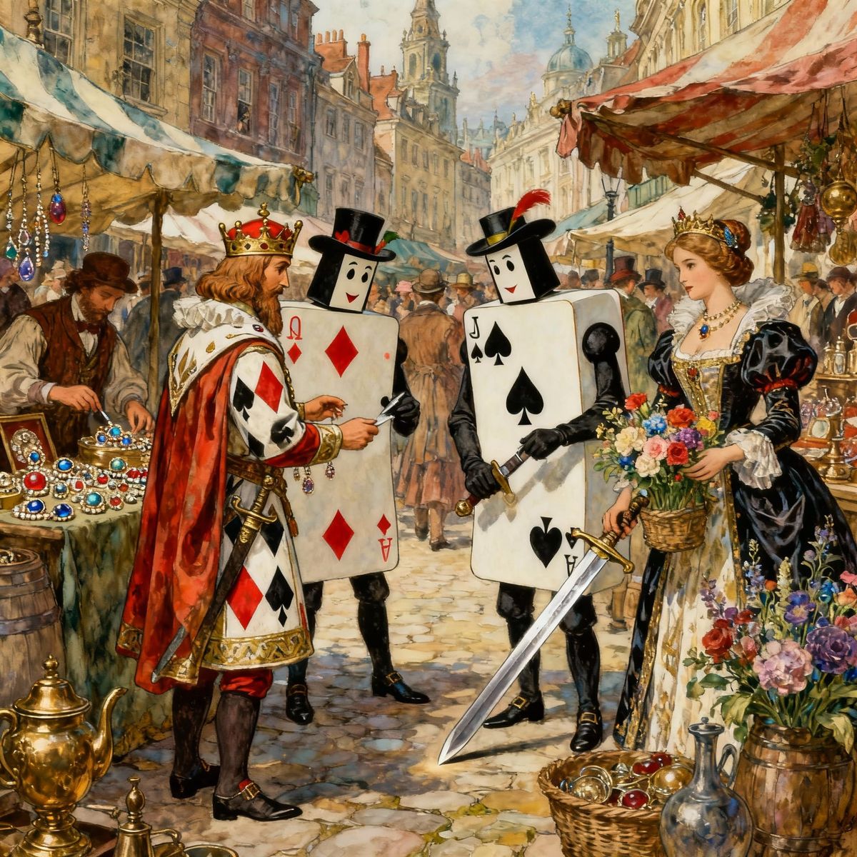 This image depicts a lively Victorian street market with anthropomorphic playing cards as vendors. A King of Diamonds bargains for jewels in a richly detailed, painterly historical fantasy illustration.