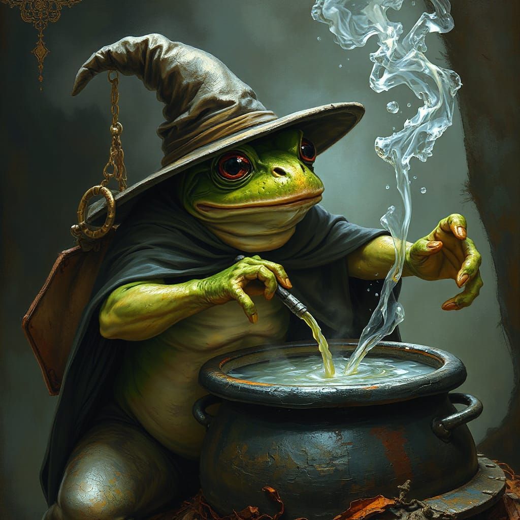 A dark fantasy image of a frog dressed as a witch, stirring a cauldron. The piece features intricate textures and a surreal, biomechanical aesthetic.