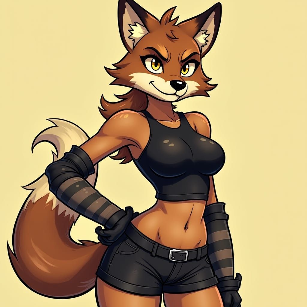 This image shows a furry, anthropomorphic wolf in a ROTTMNT-inspired style. The wolf has brown and cream fur, golden eyes, and wears a black crop top with shorts, in a flirtatious pose.