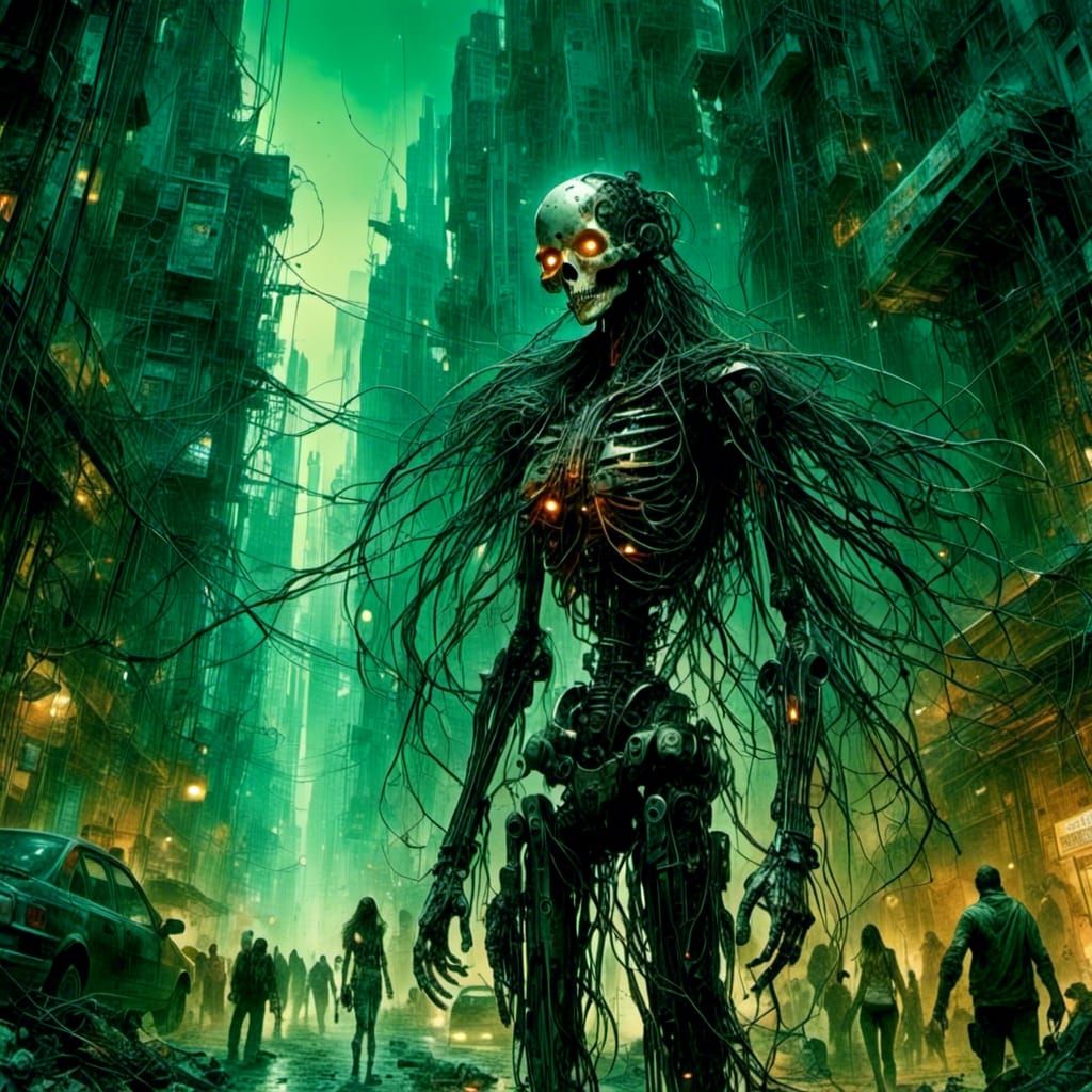 A vibrant scene of cybernetic citizens moving through a decaying megacity filled with crumbling skyscrapers and neon lights, as drones fill the twilight skies in a cyberpunk aesthetic.