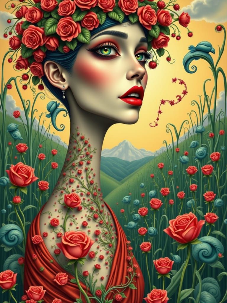 A striking picture of a whimsical woman in an elegant gown escaping societal norms. The surreal portrait features dreamlike scenery, bold colors, and delicate swirling lines in a nouveau style.