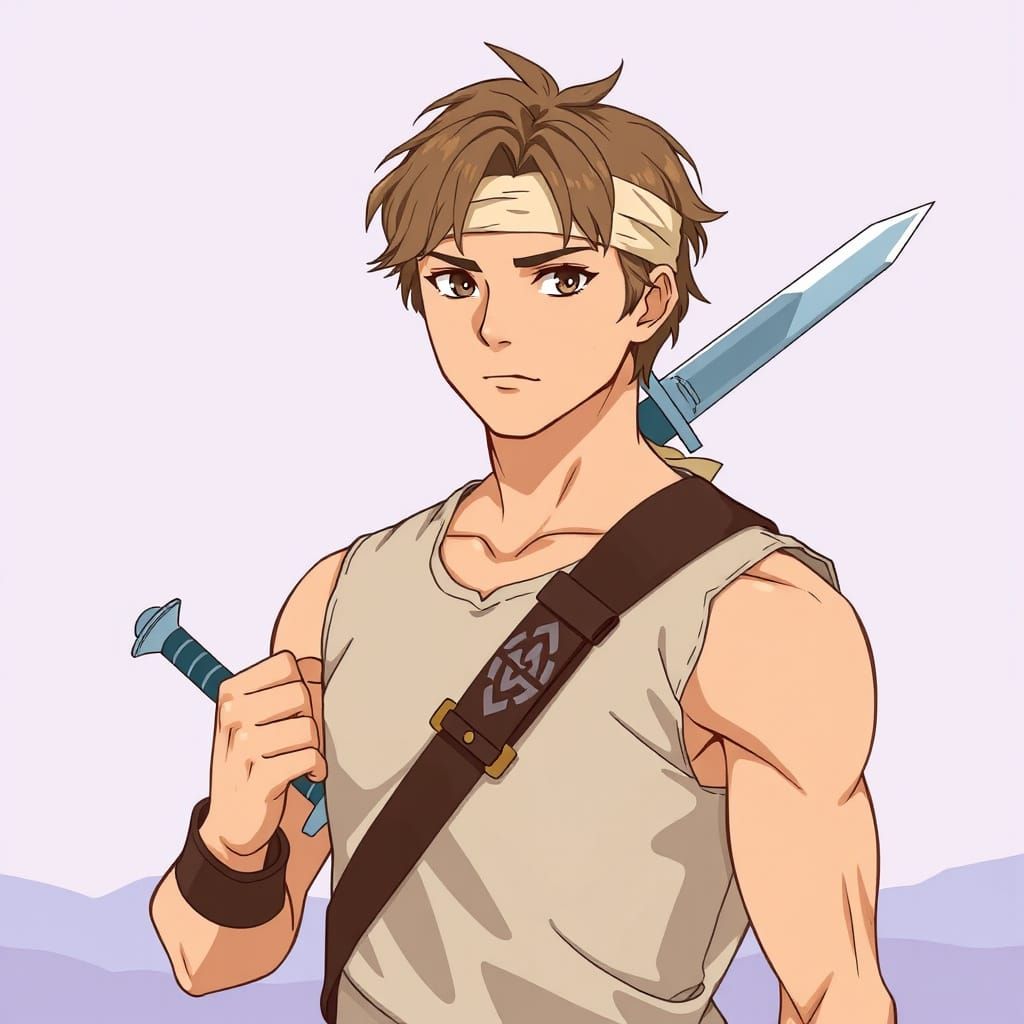 A young man stands confidently, holding a long sword with a dark design on the hilt. He wears a light beige tunic and a cream headband, with a soft, diffused lighting casting subtle shadows. The muted colors create a fantasy-like atmosphere, with a gradient background of light purple and lavender hues.