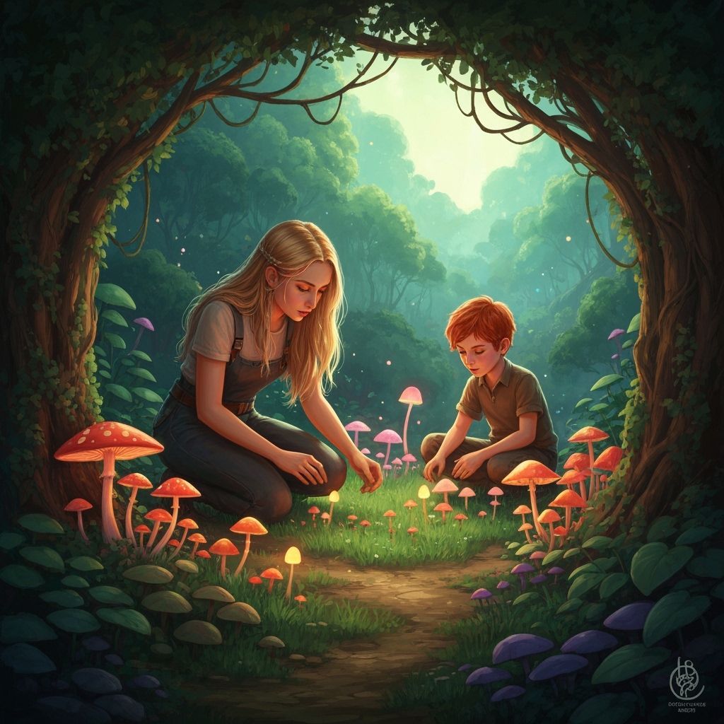 A whimsical scene of a woman and young boy cultivating a glowing mushroom garden in a secluded valley. Dreamcore fantasy art with soft lighting and earthy tones.