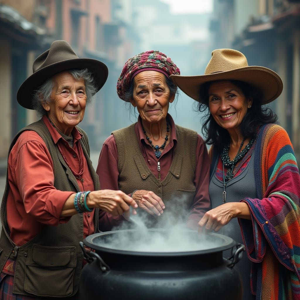 A striking picture of three modern shaman women of diverse backgrounds. They are smiling and cooking over a steaming cauldron in an urban wasteland, rendered with hyper-realistic faces and vibrant magical realism.