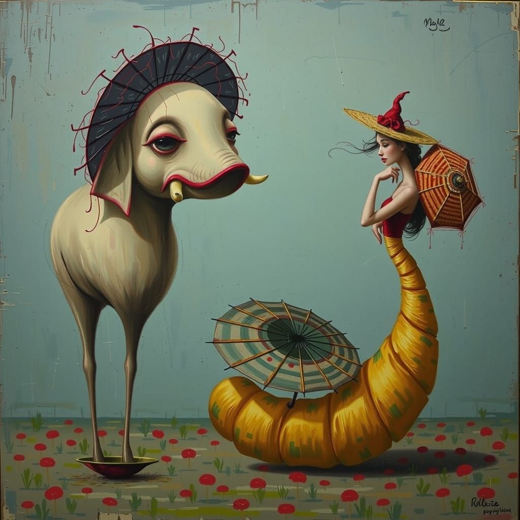 A vibrant impressionist painting of a woman in a red dress dancing with a weathered elephant under an umbrella. Dynamic brushstrokes create a lively background with bold colors.