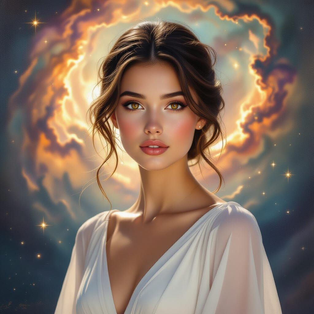 A captivating image of a woman with porcelain skin standing before a cosmic nebula. The ethereal scene is illuminated by starlight, rendered with hyper-realistic detail, and has the feel of surreal digital painting.