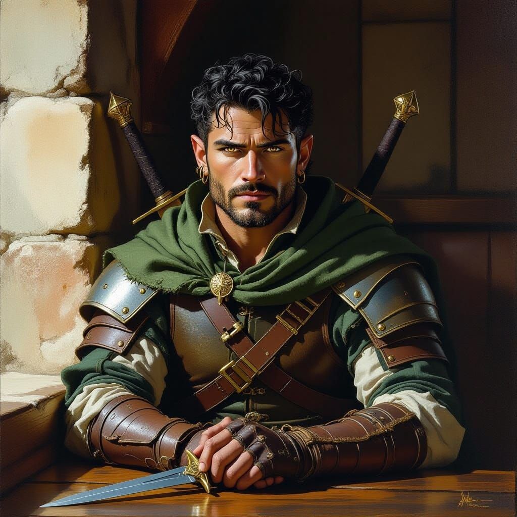 A detailed digital painting of a male halfling fighter in a tavern. He is dressed in leathers, with twin scimitars, rendered with deep colors and intricate details in a matte style.