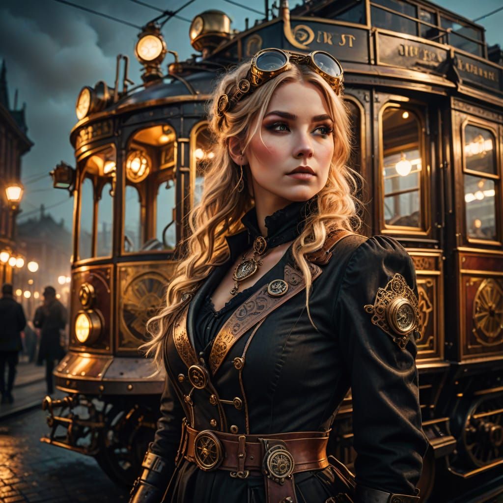 This image shows a blonde woman in steampunk attire posing before a steampunk tram at night. The close-up shot features copper accents, fog, warm backlight, and vibrant colors in a cinematic style.