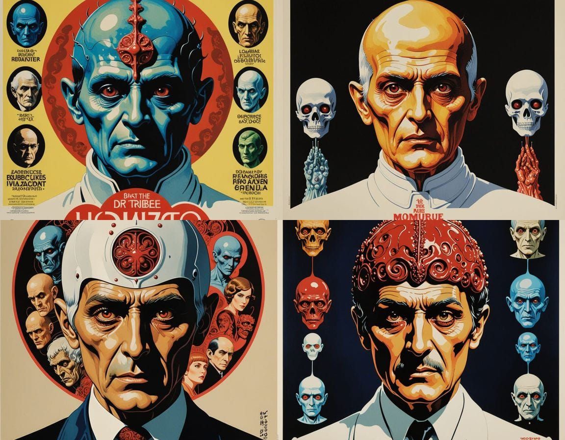 This image is a minimalist take on a 1960s horror movie poster, featuring a bizarre and disturbing homunculus with deflated organs, inspired by the style of the Stenberg brothers and the works of Dr. Phibes.
