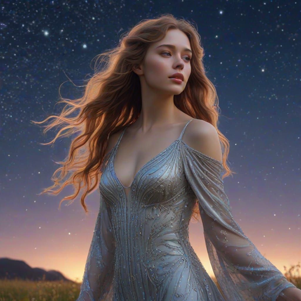 A stunning image of a woman with long hair in a starlit field, wearing a celestial gown. The image is reminiscent of Art Nouveau, featuring ornate cosmic motifs and silver swirls.