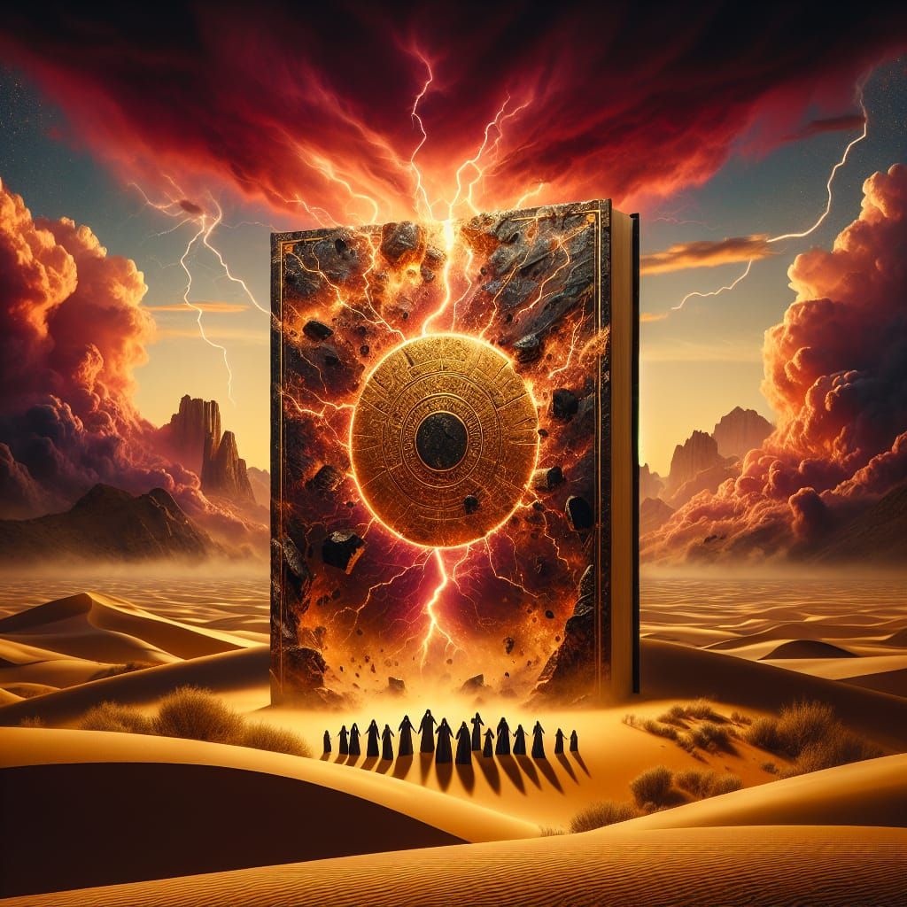 This image depicts a dramatic book cover with a crimson desert sky, dark storm clouds, and lightning. A massive cracked stone tablet lies in the sand, illuminated by golden light, with shadowy figures bowing nearby. It's rendered in a detailed matte painting style.
