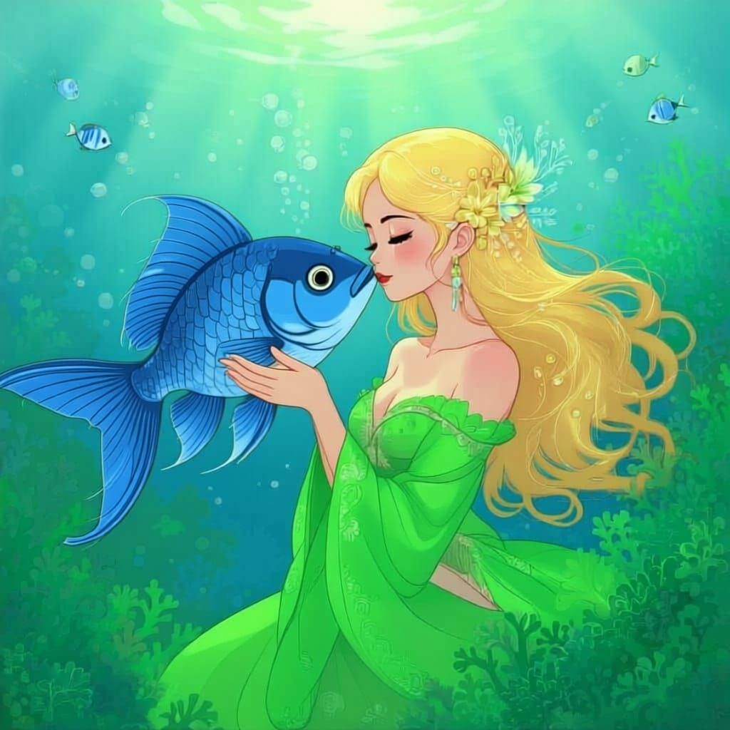 This image depicts a golden fish tenderly kissing a beautiful alien woman, creating a whimsical and surreal scene.