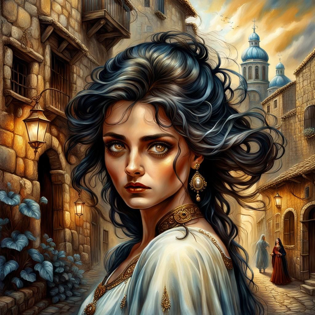 A digital painting of a dark-haired medieval woman with striking eyes on a Maltese street. Golden lighting and deep colors create a fantastical aesthetic. The image is a detailed matte painting.