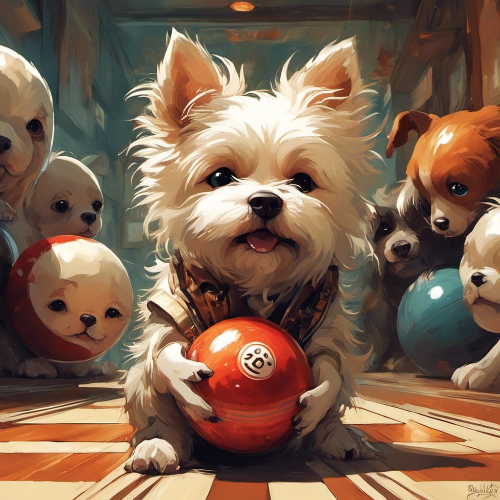 A striking picture of an anthropomorphic dog bowling on a sunny day. The image features intricate detail, soft fur, gorgeous eyes, and bright dramatic lighting. As 3D rendered digital art.