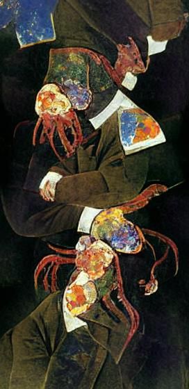 A surreal scene of abstract figures in a dreamlike landscape. The image showcases a blend of surrealist and expressionist styles, with organic forms reminiscent of early 20th-century art.