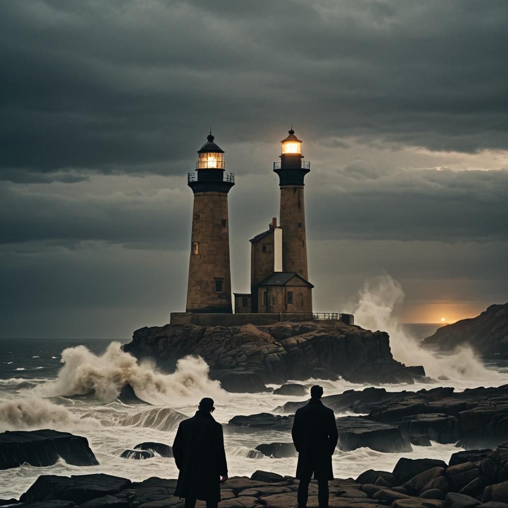 A film noir inspired image of a man in a black coat at a lighthouse. Features high contrast, dramatic shadows, and atmospheric lighting with warm golden and bourbon tones.