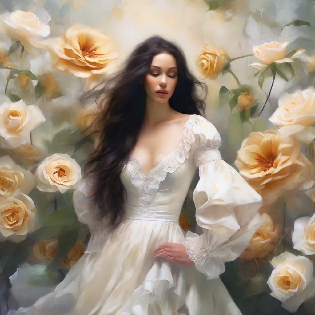 A surreal full body portrait of a woman wearing a pirate shirt and thigh-high boots, set amidst swirling dust, falling flower petals, and lush greenery. The image is rendered with soft brushstrokes and delicate colors.