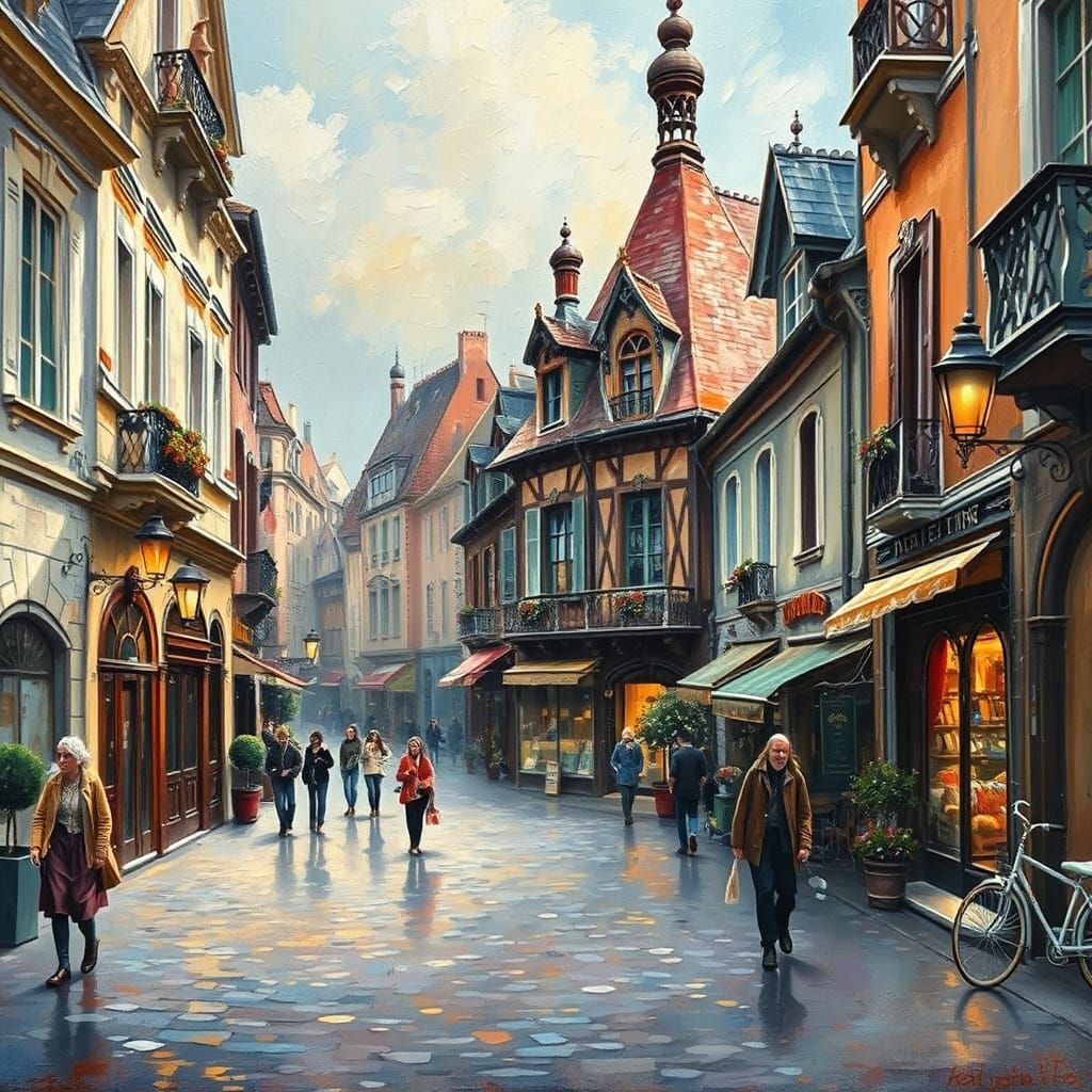 This image depicts a serene zone piétonne in a vintage ville, where people stroll amidst intricate architecture, blended with neo-impressionist and expressionist flair, reminiscent of oil painting with textured acrylic layers and ethereal fantasy elements.