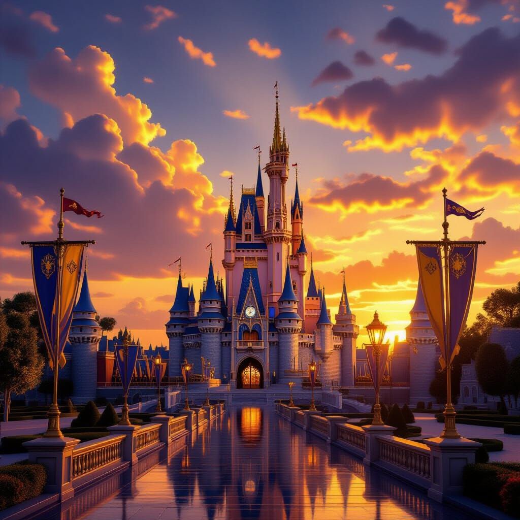 This image shows a highly detailed, magical scene of a royal palace bathed in the epic golden light of sunset, with banners waving from its towers.