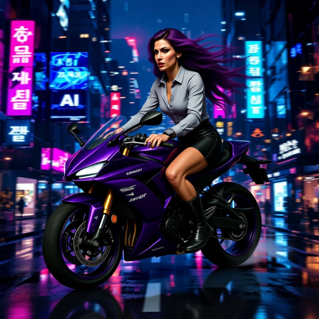 A nighttime view of a futuristic Korean street with skyscrapers. Reflected neon lights create a cyberpunk aesthetic, enhanced by holographic ads and a misty atmosphere.