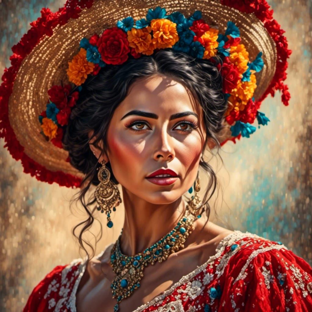 A striking portrait of a Mexican woman with vibrant colors and intricate details. The artwork evokes a vintage Southwestern style.