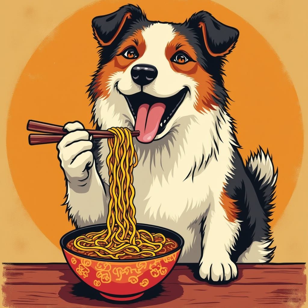 This image depicts a vintage Japanese poster of a dog eating ramen. The vector graphic is presented in a retro painting style.