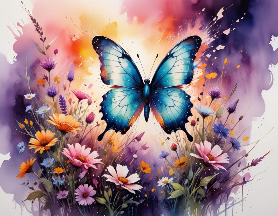 A vibrant butterfly flits through a wildflower meadow at sunset. Rendered as a digital watercolor illustration in deep purples and pinks with emerald accents, the scene is bathed in cinematic lighting.