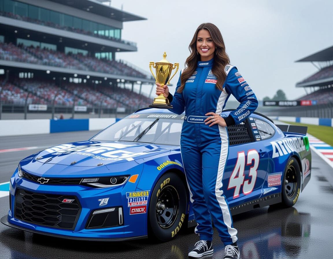 A hyperrealistic portrait of a smiling, brunette woman in a blue racing uniform holding a golden cup next to a blue NASCAR race car on a track. This image is rendered with art deco and cinematic techniques.