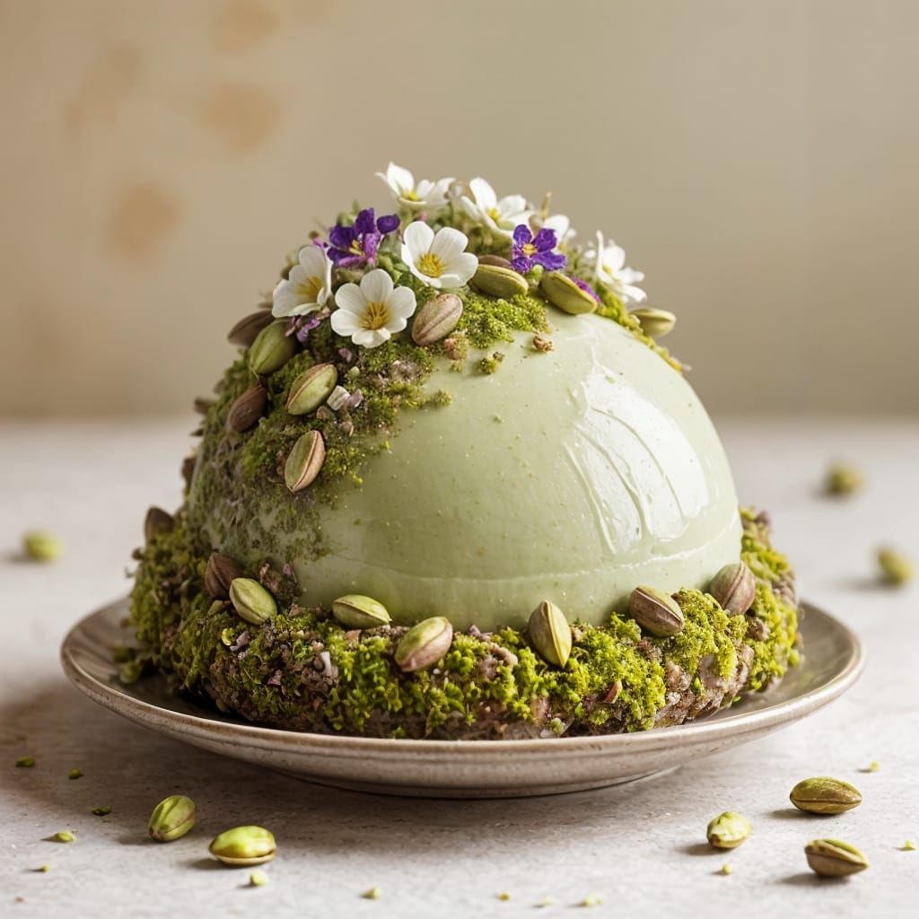 Pistachio Garden A pistachio mousse dome shaped like a tiny moss-covered hill, decorated with edible flowers and candied pistachios. Beeswax shards glimmer in the light as the camera pans low across the plate, evoking a magical edible garden.